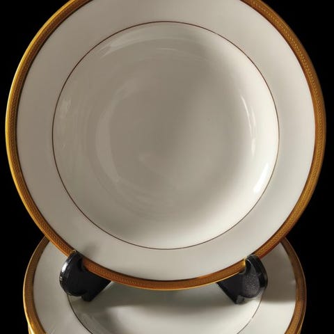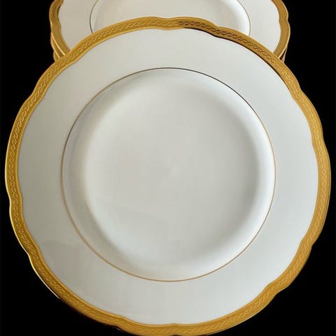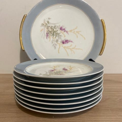 Middagstallerken fremstillet i Limonges med autentisk stempel på bagsiden. Blomstermotiv i midten. Kanter med guldfinish og blomsterdetaljer.