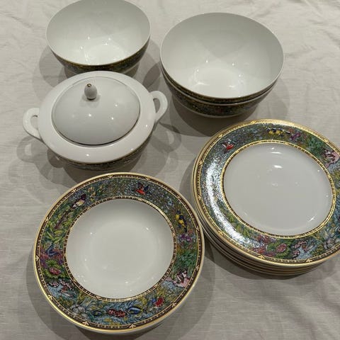 Superb porcelænsservicet signeret Villeroy & Boch, fra den prestigefyldte Burgenland Bleu-kollektion. Denne ikoniske kollektion tiltaler med sine finely detaljerede landskabsscener og delikate blomstermotiver, karakteristika for husets raffinement og håndværk.