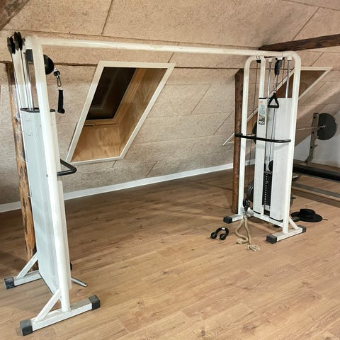Fint tårn som fungere som det skal. 2 x 100 kg. vægte. Selve tårnet er bundsolidt. Har ikke mærket, men købt af firmafitness. Kommer med diverse håndtag og stænger som ses på billedet. Står afskilt lige til at tage under armen. Tror at det hele vejer over 300 kg.