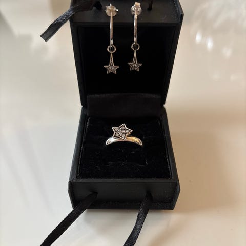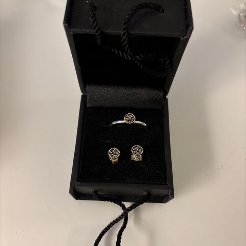 Ring str. XS og øreringe med sløjfe og sten i midten - sælges som sæt
