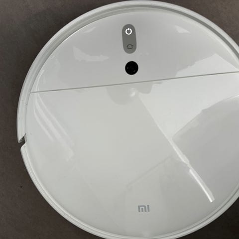 Xiaomi Mi Robot Vacuum støvsuger i hvid farve. En robotstøvsuger designet til automatiseret rengøring med indbyggede sensorer og børster til effektiv fjernelse af støv og snavs.