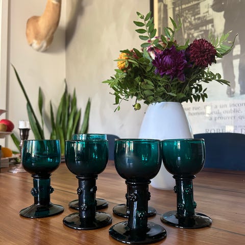 Vintage Rømerglas fra Holmegaard, grøn fod, 1970’erne, mønstret, retro stil – perfekt til vin eller dessert.