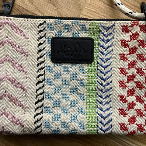 Taske i stof til kvinde med mønstret design i brune og sorte nuancer. Tasken har to sorte stropper og et rektangulært dekorativt element foran. Mærket LaLa Berlin.