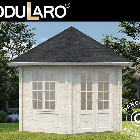 Havepavillon i træ med hvid maling. Pavillonen har mange vinduer og et tag med sort tagpap. Velegnet til udendørs brug som et lyst og beskyttet opholdssted i haven.