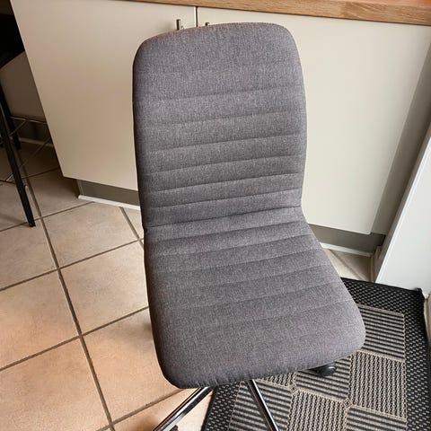 Kontorstol med gråt stofbetræk, armlæn og hjul. Designet til brug ved skrivebord med fokus på komfort og bevægelsesfrihed.