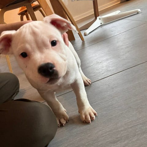 Love er 2 år og 11 måneder, rolig, kærlig og med en rigtig babyagtig personlighed. Hun elsker nærvær og putteture på sofaen, sengen eller endda computerdesken 😅🐶