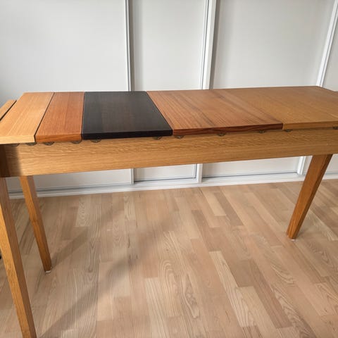 Bolia skrivebord, som har en lille træ flænge som kan ses på et af billederne. Skrivebordet har funktionen af at åbne og lukke lågerne uden problemer, og har dybe rum der kan bruges til opbevaring.