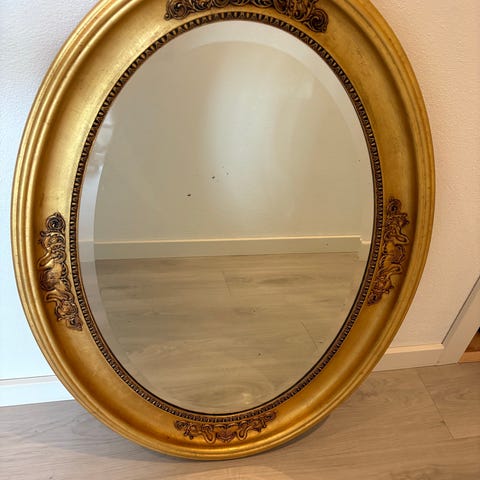 Elegant og stemningsfuldt retro-sæt bestående af ét ovalt guldspejl samt to originale væglamper i guldfarvet/messing-look. Sættet har et tydeligt vintage/retro-udtryk og egner sig særdeles godt til entré, stue, soveværelse eller badeværelse med klassisk eller mid-century stil.