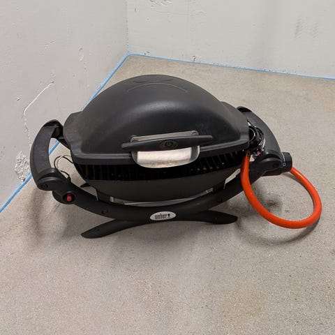 Weber Q-serie gasgrill i sort farve med låg og integreret termometer. Grillen er designet til udendørs brug og er egnet til tilberedning af mad med gas som brændstof. Grillen har et robust design med håndtag og sideborde til opbevaring og arbejdsplads. Der medfølger en helt ny gasflaske i kompositmateriale, som er let og holdbar.