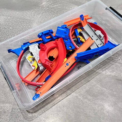 Hot Wheels Massive Loop Multiracer legetøj med store loop-elementer og racerbane. Inkluderer blå og orange baneelementer.
