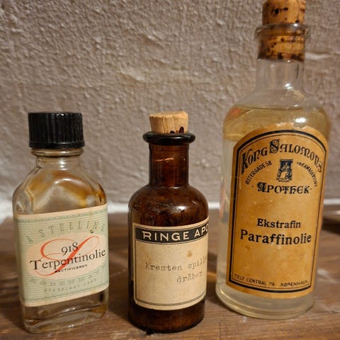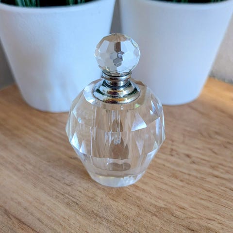 Tre små fasetslibet krystal parafumeflakoner sandsynligvis fra Oleg Cassini, men de er ikke signeret. På låget er monteret en glas pind til at påføre parafumen med.