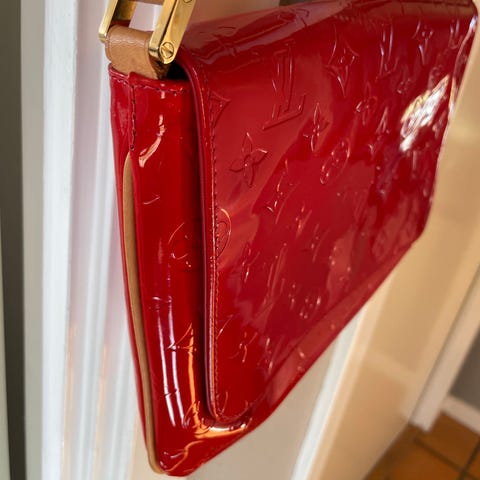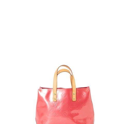 Smuk og livlig Louis Vuitton Reade PM i blankt rødt Monogram Vernis-læder med håndtag i naturligt vachetta-læder og guldfarvet hardware. Tasken kombinerer et elegant, feminint udtryk med Louis Vuittons karakteristiske håndværk. Den kompakte størrelse gør den ideel til hverdag eller som en chic lille shopper, og den glansfulde lakfinish tilføjer et luksuriøst touch til ethvert outfit.