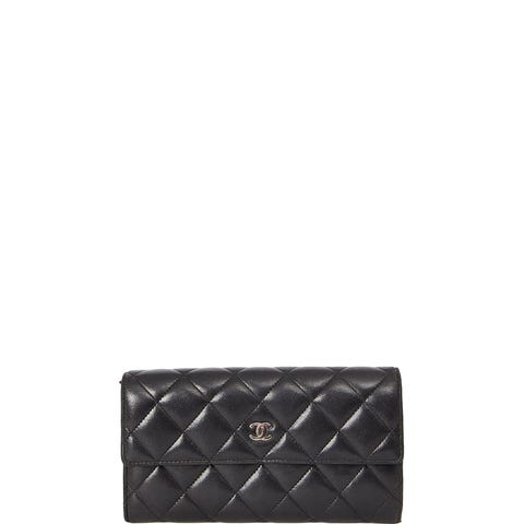 Smuk Chanel pung i det ikoniske quiltede lammeskind med klassisk CC-logo i guld. En elegant og praktisk pung med plads til kort, mønter og sedler. Den perfekte tilføjelse til enhver Chanel-samling og ideel til både hverdag og aftenbrug.