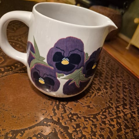 Super flot og farverig kande fra Aluminia/Kongligt Porcelæns Tenera serie i 60'erne af Berte Jessen. Den er perfekt som te kande, en dag med varm kakao, eller sågar til mælk på bordet, til havregrynene eller til i kaffen. Der er intakt låg som, udover at gøre den ekstra fin, også holder på varmen :) Kanden er på samme tid, med sin pynt, delikat og lidt modig. Jeg ser blomster og kakaobønner, Ved ikke hvad du ser? ;) Synes den er så fin, at den pynter selv når den ikke er i brug. Fx på en hylde eller i en vindueskarm. Signeret og i super stand. Synes lyset gør den lidt uret :) Den er mere HVID i virkeligheden. #kongeligtporcelæn #tenera #keramik #glasur #fajance #aluminia #hot #flot #ogsåtom #teafor2 #2fortea #varmkakao #flødeskum #kande #tekande #helogfin #brugbar #eksotisk #65årgammel
