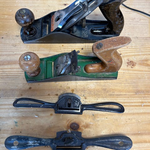 Træhøvl i træmateriale med håndtag og metalblad. Anvendes til at høvle og glatte træoverflader.