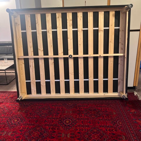 Sengestellet har få brugsspor og står meget flot. Har et perlemorsskinnende stof.
