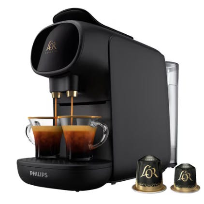 L'OR Barista Passione Rossa espressomaskine i rød farve. Maskinen er designet til at brygge espresso ved hjælp af kapsler og har dobbelt udløb til to kopper samtidigt. Velegnet til hjemmebrug.