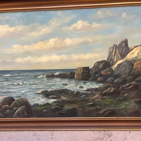 V. Balle maleri af et landskab med træer og en sø. Maleriet er indrammet i en dekorativ ramme. Signeret af kunstneren V. Balle
