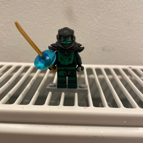 LEGO NINJAGO minifigur med blå maske, sort og blå påklædning, samt detaljeret tryk på for- og bagside. Figuren inkluderer ekstra dele som arme, ben og hoved med forskellige udtryk.