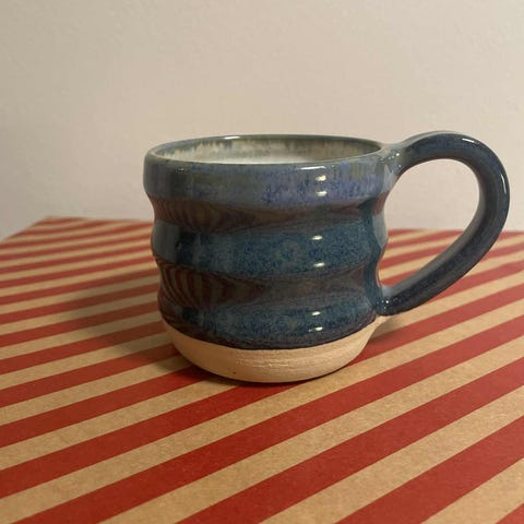 Keramik kop med gul og beige farve. Bølgekop med hank. Velegnet til varme drikke og kan komme i opvaskemaskinen.