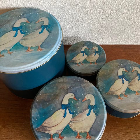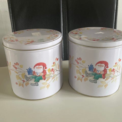 2 små kagedåser 11 cm høje, 10 i dia. Den ene har en lille “bule” - se billede 4. Sender ikke.