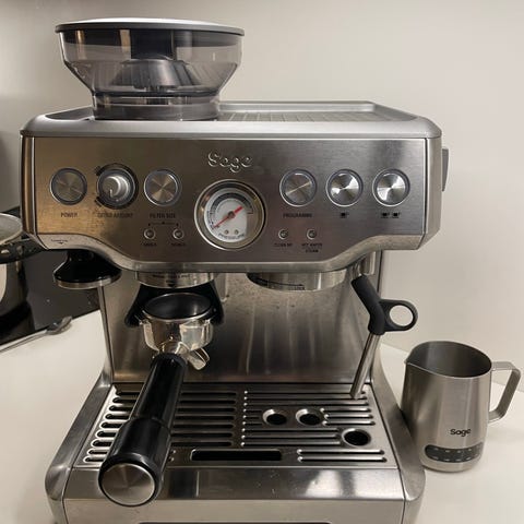 1 1/2 år gammel, Sage barista touch. En semiautomatisk maskine, som laver fremragende espresso, samt laver perfekt mælk til at lave latteart, som du kan se på billedet