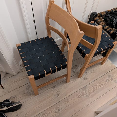 To pæne spisebordsstole. De har nogle mærker på ryglændene som det måske kan ses
