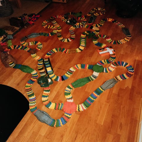 Flexi trax legetøjsbane sæt bestående af forskellige dele til samling, herunder spor, broer, biler og fjernbetjeninger. Sættet indeholder mange farverige komponenter i plastik, designet til børn. Det kan bruges til at bygge og lege med racerbaneopstillinger.