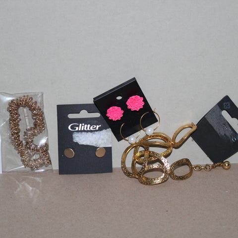 Noget er brugt (ørestikkere på sort plast) og andet er nyt. Og noget er både ubrugt/nyt og håndlavet.