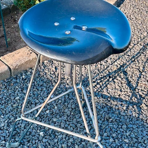Skammel i krom og sort designet af Yasu Sasamoto for Dulton i 70'erne. Ét stykke med justerbar højde og et foldbart sæde, der kan foldes helt sammen. Maksimal højde 60 cm.