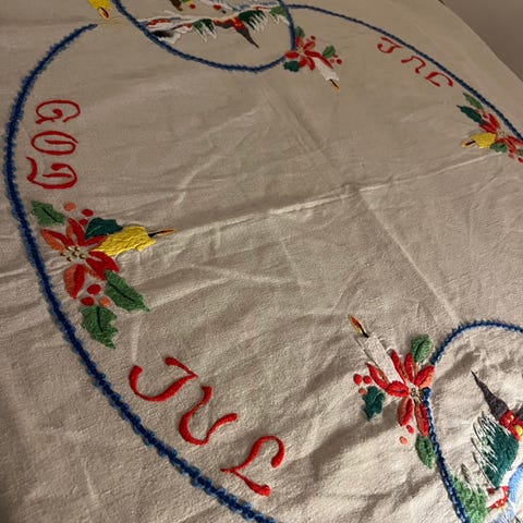 Meget flot juledug. Mønstret er vævet ind i dugen.