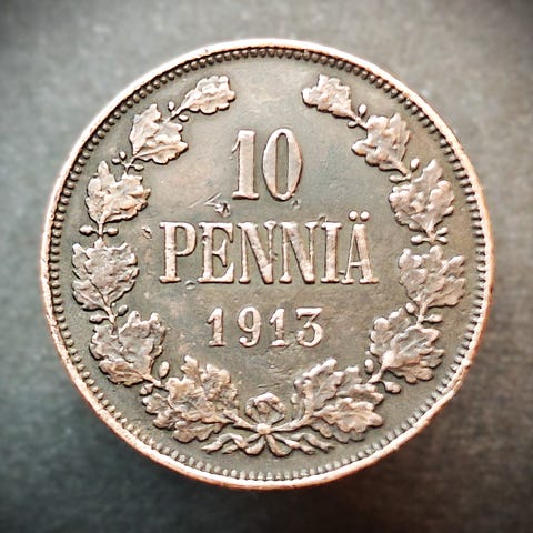 Antik gammel Ti Penni / Penniä fra Finland fra 1919. Denne type mønt blev produceret i perioden 1919-1940.