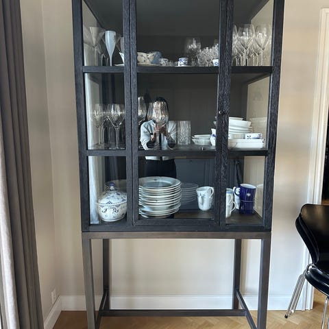 Speciallavet Vitrineskab fra kvindesmedien i Christiania. 100 cm bred, 33,5 cm dyb, 216 cm højt. 32 cm højde mellem hylderne.