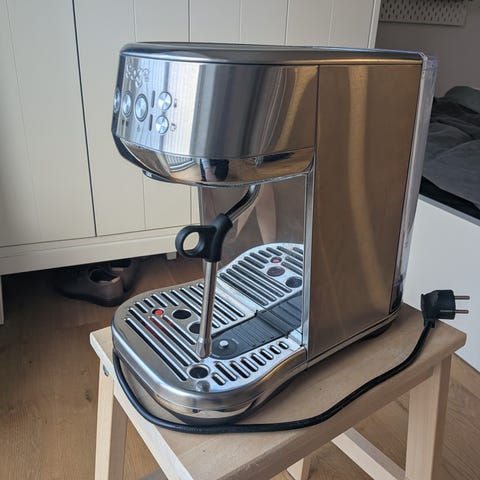 Sage Bambino espressomaskine og kaffekværn. Maskinen har en rustfri stålfinish og inkluderer portafilter til brygning af espresso. Kaffekværnen er justerbar for at tilpasse formalingsgraden. Fungerer begge upåklageligt. Sælges grundet opgradering.