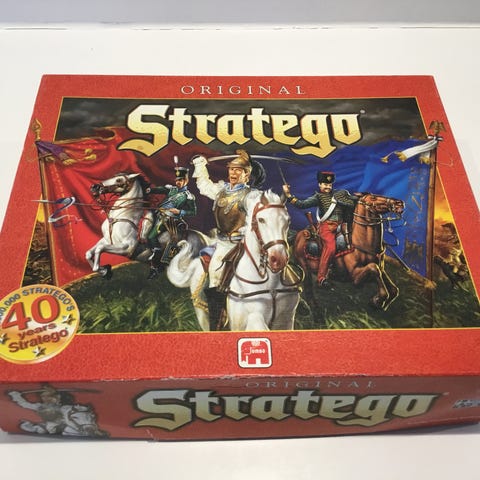 Stratego brætspil med spilleplade, røde og blå spillebrikker samt spillekort. Spillet indeholder elementer til to spillere og er designet til strategisk spil.