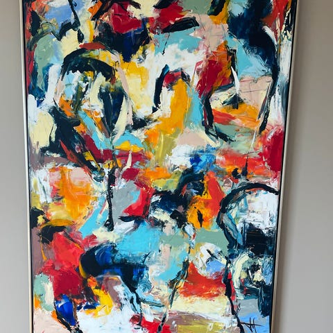 Abstrakt maleri med farverige figurer i en kombination af grønne, blå, orange, gule og røde nuancer. Maleriet viser flere menneskelignende skikkelser i bevægelse og er udført i en ekspressiv stil.