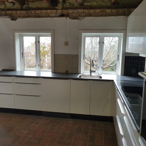 Køkkenet er af ældre dato, men velholdt og fungerer fint. Induktionskomfur, emhætte, opvaskemaskine. Kan afhentes fra d. 4 januar.
