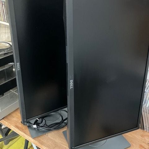2 monitorer i fin stand med indbygget sokkel så man kan justere højde, hvor meget den tilter og om den skal drejes så den er højere end bred