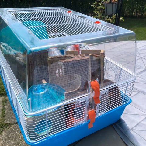 Min mor sælger dette bur, der har været brugt til en kanin. Under buret er der plads til opbevaring af tilbehør til dyret.
