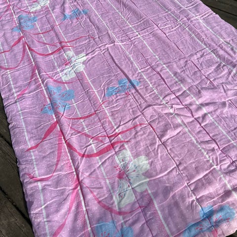 Økologisk vattæppe fra JYSK, som har blomster i blå, grønne og gule nuancer på den ene side og striber i blå, grønne, gule og lilla på den anden side.