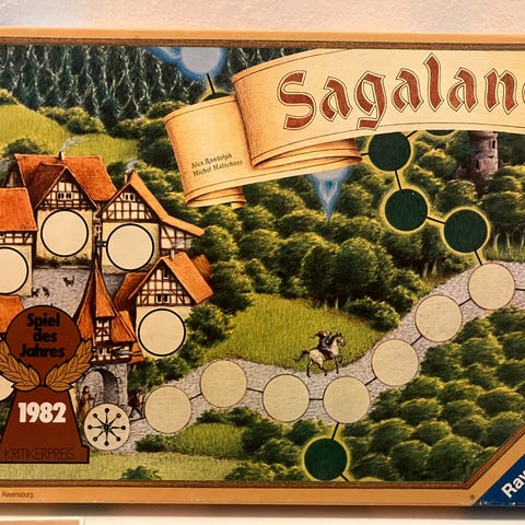 Ravensburger Sagaland brætspil med spilleplade, kort og regler. Spillet foregår i en eventyrverden, hvor spillere skal finde skjulte skatte ved at bevæge sig rundt på spillepladen og bruge kortene til at afsløre steder. Indeholder spilleplade, kort og vejledning.
