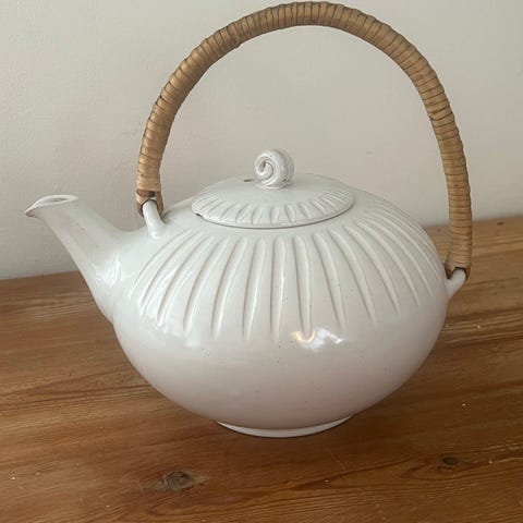 Rörstrand tekande i porcelæn med integreret låg og indbygget sukkerskål opdelt i to rum til sukker og soda. Tekanden har en håndtag og en tud med to huller. Farven er hvid, og designet er funktionelt med plads til forskellige sødestoffer.