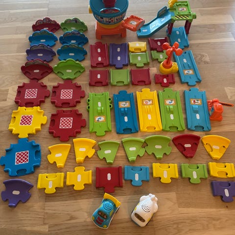 Vtech bilbane inkl en fjernstyret bil som har lyd musik og tale og kan kører frem og tilbage. Der kan tilkobles yderligere 2 biler til fjernbetjeningen.