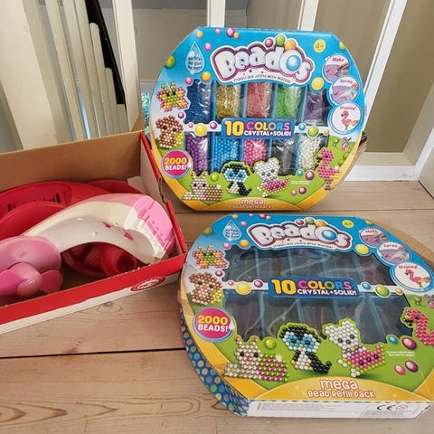 Beados perlestartssæt / starter kit med perler, som kan sættes sammen med vand, så det er nemt at lave perleplader for mindre børn. Der medfølger vejledning og æske. Alt kommer fra røgfrit hjem.