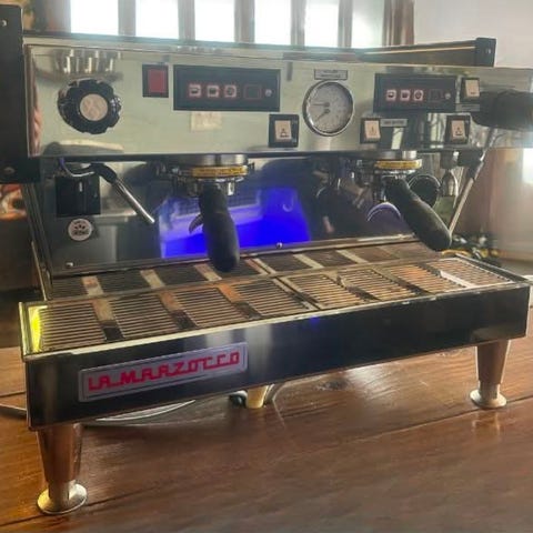 La Marzocco Linea M kaffemaskine med tre grupper, designet til professionel brug. Maskinen har et robust metalhus og er velegnet til tilberedning af espresso og andre kaffedrikke i café- og restaurationsmiljøer.