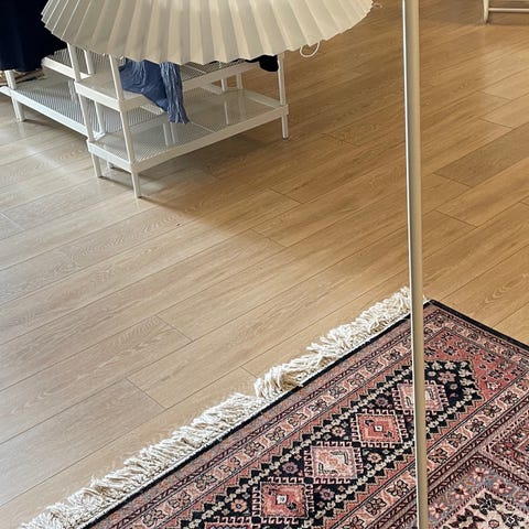 Gulvlampe fra Le Klint model 323, designet af Christian Hvidt. Lampen er i forkromet stål og sort lakeret fod. Højden er ca 134 cm og lampen er højde justerbar. Lampen sælges med original Le Klint plisseret skærm, der dog har nogle trykmærker.