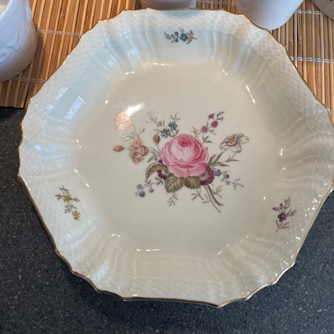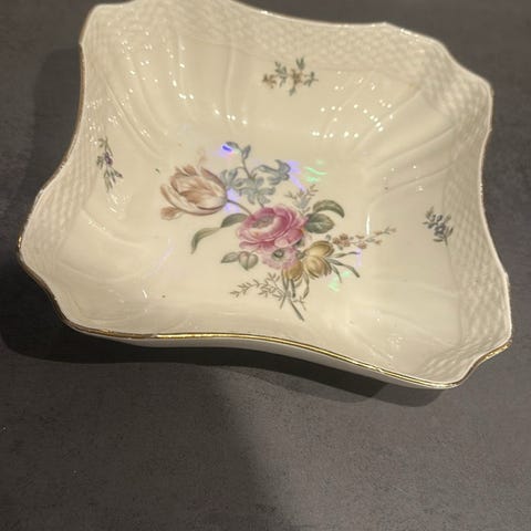 Dette er et kantet fad i Royal Copenhagens "Frijsenborg" mønster.