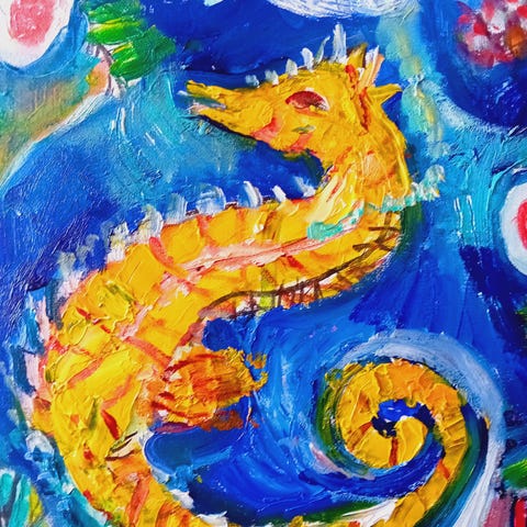 Hesten Håb, Burning World maleri, der forestiller en hest med røde detaljer på en abstrakt baggrund med varme farver. Maleriet indeholder også hvide fugle og forskellige symboler, hvilket giver det et unikt og kunstnerisk udtryk.