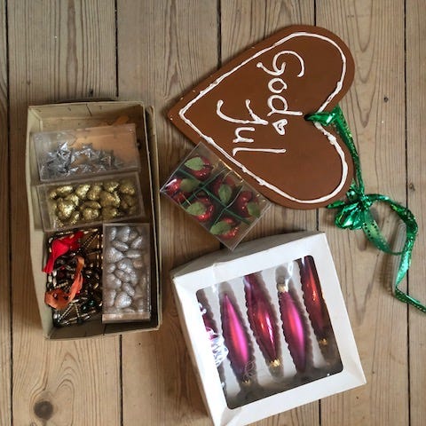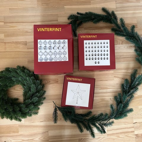 IKEA Julepynt sæt med forskellige ornamenter i rød og sølv. Sættet indeholder julekugler, hjerter og rensdyrfigurer i glitrende og mat finish. Velegnet til dekoration i julen.