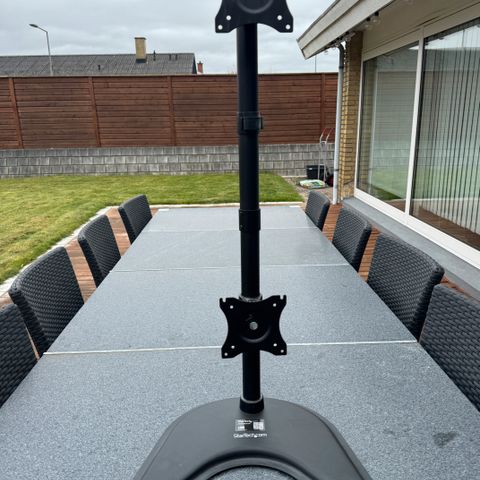 I changed out my dual monitor setup and no longer need this monitor mount. It's solid! Easy to mount on a desk, has a plastic frame over the metal adjustable arms for hiding cables and allows for horizontal and verital positioning. Great for getting the monitors off the factory stand and out of the way.